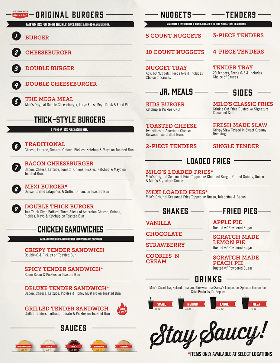 When it comes to satisfying your cravings for a delicious burger, Milo's Hamburgers Menu has you covered with a range of mouth-watering options. Located at 1830 Patriot Dr SW in Cullman, AL, this spot offers a comforting, no-frills menu that’s perfect for any burger lover. From juicy, perfectly seasoned patties to fresh, crisp toppings, each bite is a delight. Whether you’re in the mood for a classic Milo’s Burger, a savory chicken sandwich, or one of their sides like crispy fries, there's something for everyone. And for those looking to make their meal extra special, there are tasty drink options and dessert choices that pair perfectly with your main course. Whatever you choose, you can count on quality, flavor, and a satisfying meal every time.